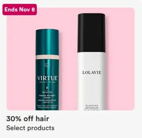 Get it while it lasts! Shop in store and get 30% off select hair products.